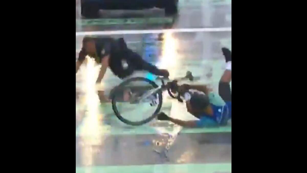 There are a couple of different ways you could ride in the Tour de France. You could be born a gifted cyclist and train hard, you could work your way up through the professional cycling ranks, or you could be like this guy and just pretend that you're a cyclist in the Tour de France. He took his bike and hopped over the barrier of a recent Tour de France stage. This man was determined to cross that finish line. The problem was, he looks NOTHING like a professional cyclist and the security was out to get him. The first security guard gives him a love tap that does nothing, so the second security guard knows what he has to do and absolutely CRUSHES the man at the finish line. This way of joining the Tour de France looks awfully painful!